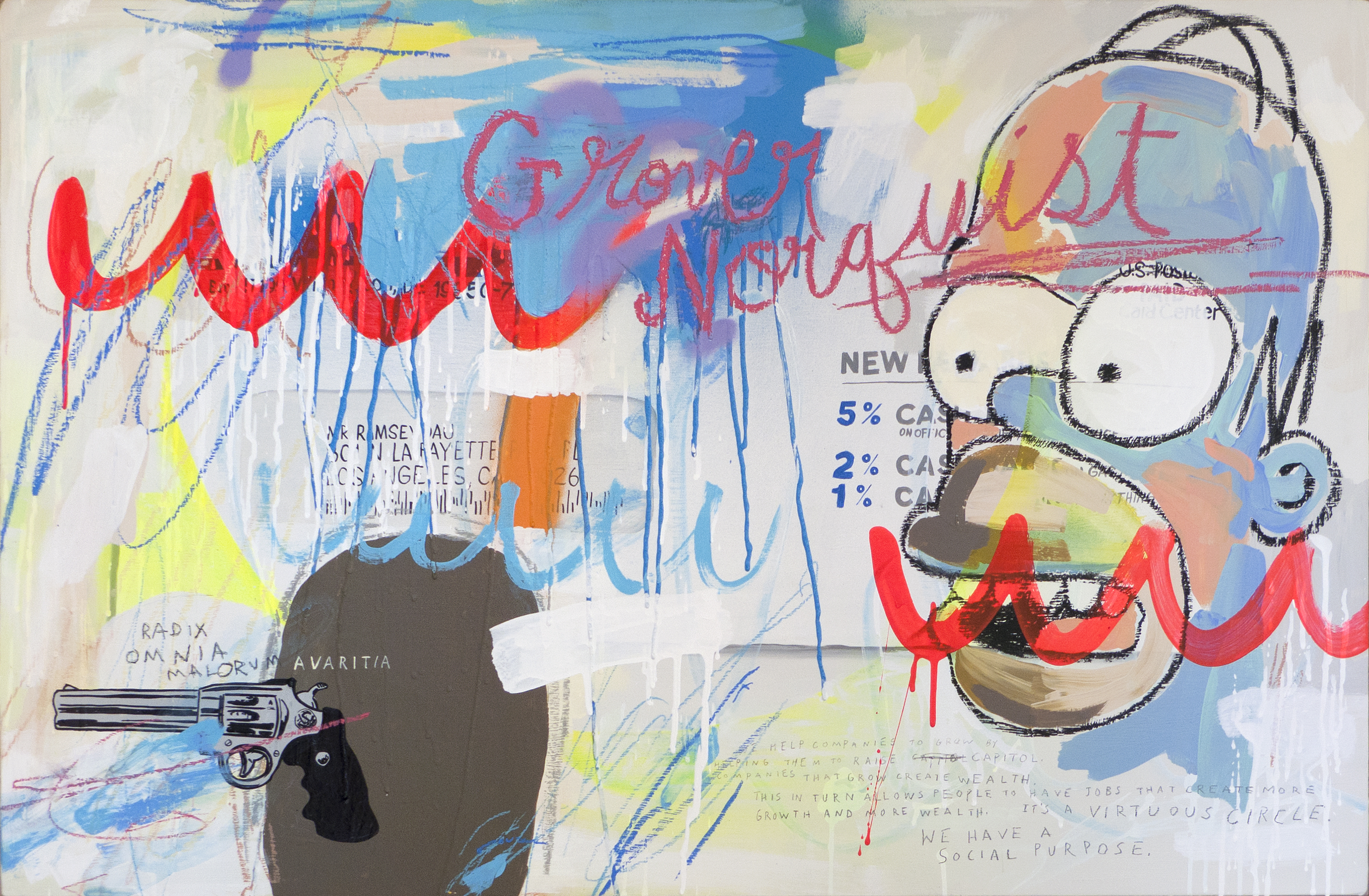 Acrylic, oil stick, spray paint, pencil on wood panel