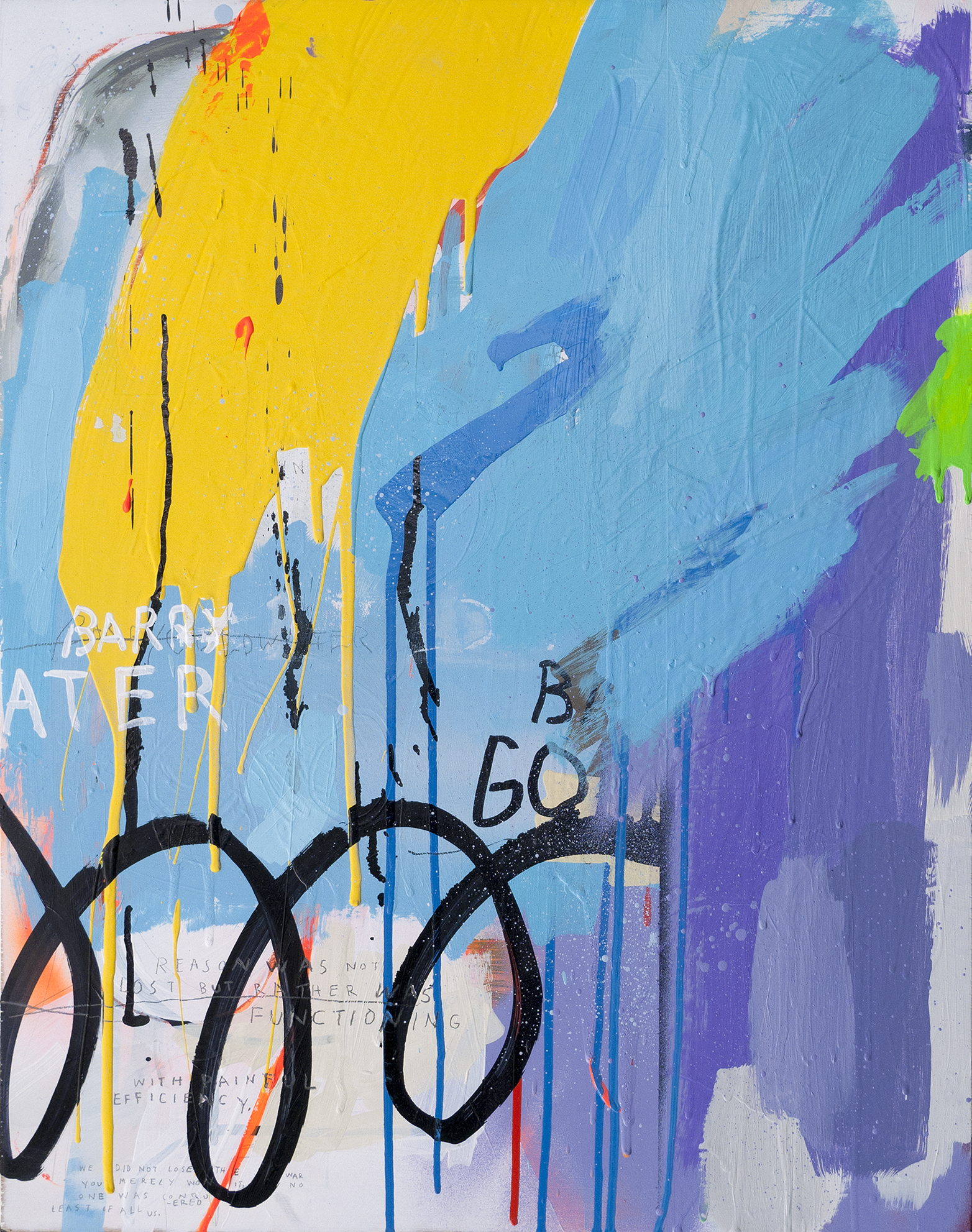 Dau’s earliest influences include Robert Rauschenburgh, Andy Warhol, and Jean-Michelle Basquiat. The selected works featured here on wood panel and paper date from 2008 to 2011 and show an obvious homage to the collaborative works made by Warhol and Basquiat in the mid-80’s. Dau’s interest in bodega/street signage shows up in these earlier works as well.